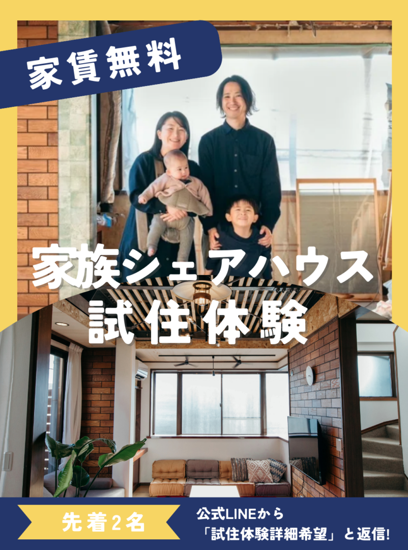 応募方法:公式LINEにご登録後、「家族シェアハウス試住体験詳細希望」と返信ください。