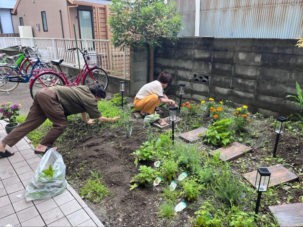 ↑ みんなで庭の雑草をとっている様子