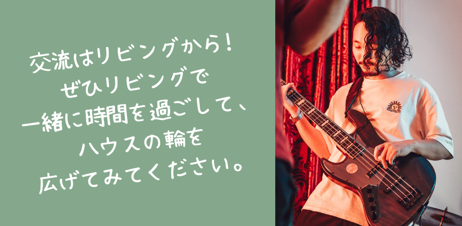 せっかくのシェアハウスなので、無理はせずとも積極的にリビングルームに行ってみるのがオススメです。リビングルームに慣れるとともに、入居者の皆さんと少しずつでもコミュニケーションをとっていくことで、どんどんハウスのことを自分のホームと思えるようになっていくと思います。また、外国からいらっしゃってる入居者の方もいるので、外国語を話せるようになりたいという方にとっては習得のための絶好の機会になるのではないかと思います。