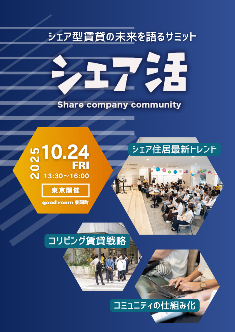 本イベント「シェア活2025」は、シェア型賃貸市場の先端を走る「グッドルーム」をゲストに迎え、次の時代に求められるシェア型賃貸の市場戦略・ブランド設計・運営ノウハウを同業者同士でシェアし合う業界唯一の同業他社勉強会です。