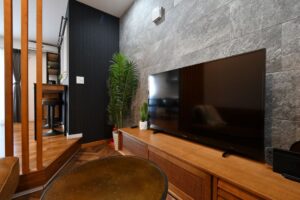 木の表情が印象的なダイニングテーブルを囲んで食事をしたり、奥のソファスペースでくつろいだりと、思い思いの時間を心地よく過ごせます。